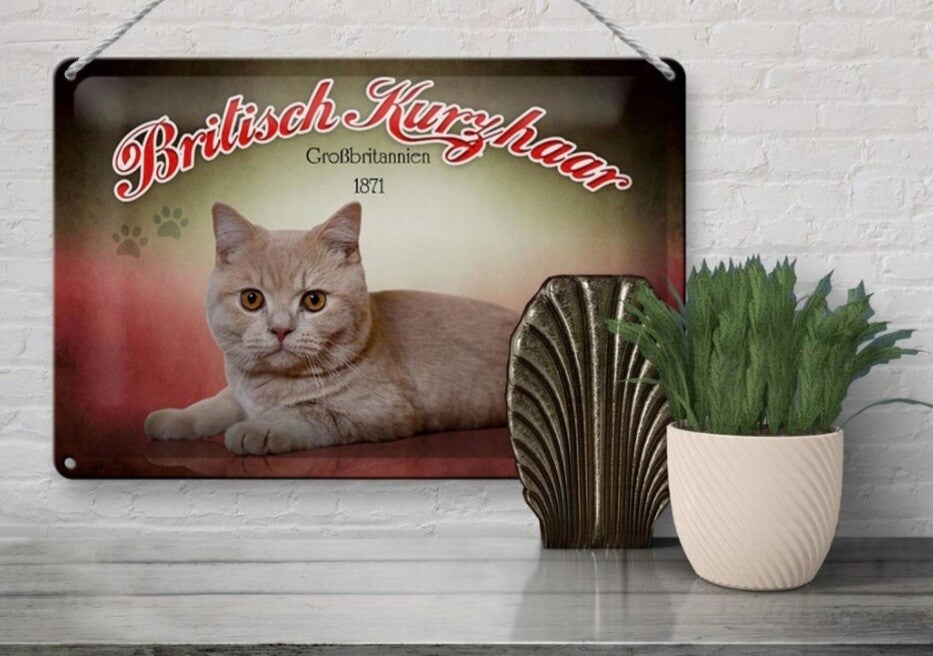 Dieses hochwertige Blechschild ist ein echter Blickfang – stilvoll, nostalgisch und mit dem gewissen Charme der Britisch Kurzhaar (auch als British Shorthair bekannt). Ein elegantes Accessoire fürs Wohnzimmer, das Katzenliebhaber garantiert begeistert.