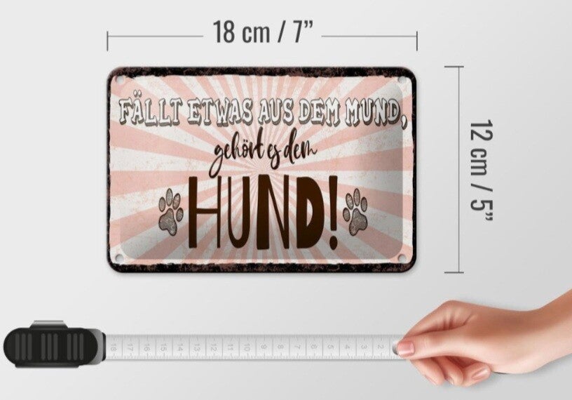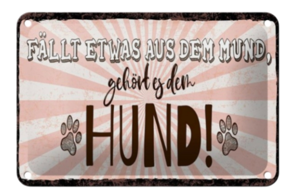 Hunde-Blechschild „FÄLLT ETWAS AUS DEM MUND, gehört es dem HUND!“ (12×18cm)