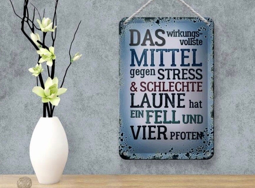 Katzen-Blechschild „Das wirkungsvollste Mittel gegen Stress und schlechte Laune hat ein Fell und vier Pfoten“ (12×18cm)