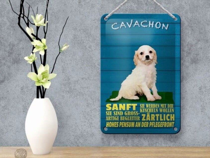 Mit seinem herzerwärmenden Charakter und verspielten Wesen ist der Cavachon ein echter Herzöffner – und dieses Blechschild zeigt es stilvoll. Ob im Eingangsbereich, Flur oder Wohnbereich – dieses charmante Statement für Cavachon-Fans bringt Freude ins Zuhause.