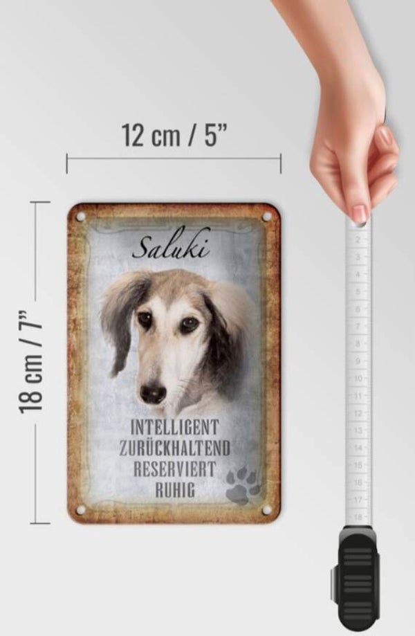 Dieses dekorative Hunde-Blechschild zeigt den eleganten Saluki im stilvollen Design – unten ergänzt durch positive Eigenschaften der Rasse. Ein liebevolles Detail für Dein Zuhause, ob Flur, Wohnzimmer oder Arbeitsbereich, und ein schönes Geschenk für Saluki-Fans.
