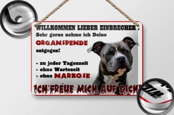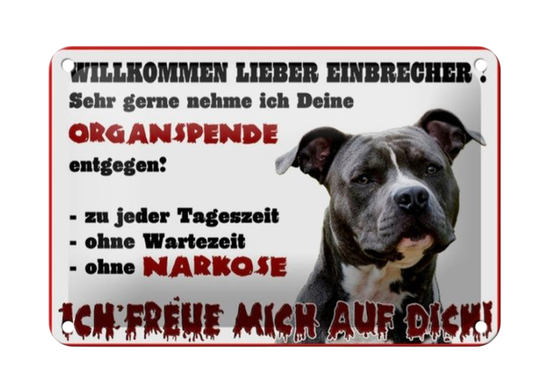 Hunde-Blechschild American Staffordshire Terrier – Willkommen, lieber Einbrecher (12x18cm)