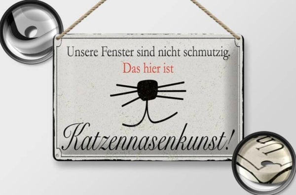 Dieses witzige Blechschild sorgt garantiert für Schmunzeln. Jeder Katzenfreund kennt die typischen Nasenabdrücke am Fenster – hier werden sie humorvoll als kleine Kunstwerke dargestellt. Ein ideales Geschenk für Katzenliebhaber und eine originelle Dekoration für Zuhause.